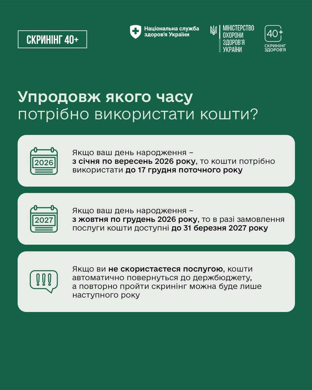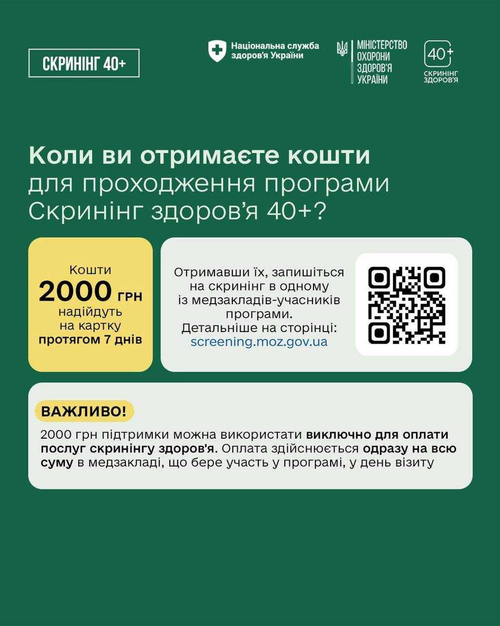 Більше інформації про програму Скринінг здоров’я 40+ та відповіді на найпоширеніші запитання читайте тут: screening.moz.gov.ua .