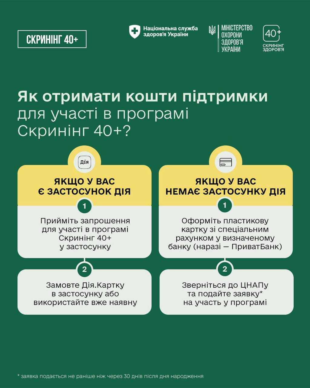 1️⃣ Запрошення на скринінг надійде у застосунок Дія на 30-й день після дня народження (для всіх громадян віком від 40 років).